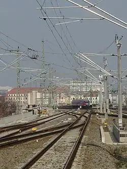 Dresden Mitte station is a through station with four platform edges. S-Bahn trains stop only on tracks 1 and 2. Tracks 3 and 4 are used as a stop for regional trains and for through traffic. Two other tracks on the eastern side of the station serve freight traffic.[15] On the southern approach to the station, the line of the Berlin–Dresden Railway Company branches through the Dresden-Friedrichstadt freight yard. North of the station is the Marien bridge over the Elbe.