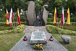 In the park is located the Monument of Fighting Mokotów of 1944 (also known as the Monument of Mokotów Insurgents), dedicated to Polish resistance fighters, mainly from the Baszta Regiment Group, who fought in the park in 1944 during the Warsaw Uprising. The monument, designed by Eugeniusz Ajewski, and unveiled in 1985, consists of a glacial erratic rock broken into two parts, with a sculpture of the Kotwica, which, during the Second World War, served as the emblem of the Polish Underground State, and the Home Army. It is a ligature of the letters P and W, symbolizing term Polska Walcząca, which in Polish, means Fighting Poland. In front of the sculpture is placed a plaque with a text commemorating the fighters. In front of the monument are held annual commemorative celebrations.[1][10]