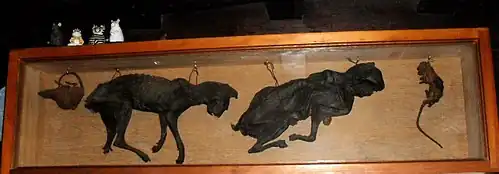 In the British Isles,[3][4] as well as in Northern Europe and North America,[5] the dried or mummified bodies of cats are frequently found concealed within structures and are believed to have been placed there to bring good luck or to protect the building and its occupants from harm.[6] The North American instances are strongly associated with European households and are most often found in buildings where shoes and witch bottles are also concealed.[7] In some cases, the animals are found deliberately posed as if in the midst of attack.[8] In other cases, they are accompanied by dried rats, mice, or birds.[2]