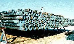 Drill pipe, is hollow, thin-walled, steel or aluminium alloy piping that is used on drilling rigs. It is hollow to allow drilling fluid to be pumped down the hole through the bit and back up the annulus. It comes in a variety of sizes, strengths, and wall thicknesses, but is typically 27 to 32 feet in length (Range 2). Longer lengths, up to 45 feet, exist (Range 3).