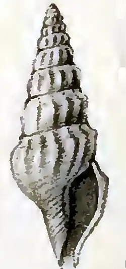 The buff-colored shell is turriculated, with an elevated spire with 10 whorls. The oblique, acute, longitudinal ribs and the incrassate, subventricose, upper whorls seem characteristic. The body whorl contains about 12 ribs. The aperture is oval. The white columella is smooth. The siphonal canal is very short.