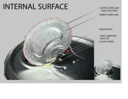 Various features of an STO beverage can lid, depicting the scored lines, the indentation which acts as a stress shield to initiate a crack at the outer scored line, a crack arrestor which prevents the crack from growing too far and completely cutting off the opening, and the crack directions ending in crack tips with some metal in between them to act as a plastic hinge.