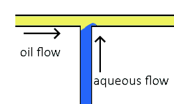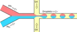 Cross-flowing is a passive formation method that involves the continuous and aqueous phases running at an angle to each other.[9] Most commonly, the channels are perpendicular in a T-shaped junction with the dispersed phase intersecting the continuous phase; other configurations such as a Y-junction are also possible.[8][11][12] The dispersed phase extends into the continuous and is stretched until shear forces break off a droplet.[13][14] In a T-junction, droplet size and formation rate are determined by the flow rate ratio and capillary number.[15] The capillary number relates the viscosity of the continuous phase, the superficial velocity of the continuous phase, and the interfacial tension.[7] Typically, the dispersed phase flow rate is slower than the continuous flow rate. T-junction formation can be further applied by adding additional channels, creating two T-junctions at one location. By adding channels, different dispersed phases can be added at the same point to create alternating droplets of different compositions.[16] Droplet size, usually above 10 μm, is limited by the channel dimensions and often produces droplets with a CV of less than 2% with a rate of up to 7 kHz.