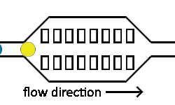 If it is important to have a uniform distribution of incubation times for the droplets, the delay line channel may contain regularly spaced constrictions.[27] Droplets flowing through a channel of uniform diameter travel at different speeds based on their radial position; droplets closer to the center of the channel move faster than those near the edges.[27] By narrowing the channel width to a fraction of its original size, droplets with higher velocities are forced to equilibrate with slower-moving droplets because the constriction allows fewer droplets to pass through at a time.[27] Another manipulation to the geometry of the delay line channel involves introducing turns to the droplets' trajectory. This increases the extent to which any reagents contained within the droplets are mixed via chaotic advection.[1] For systems requiring the incubation of 100 to 1000 droplets, traps can be fabricated in the delay line channel that store droplets separately from one another.[75][76] This provides for finer control and monitoring of individual droplets.