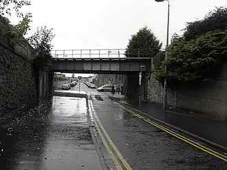 Blue line: Route taken on 12 July; from Corcrain Hall (E) along Obins Street (A) and under the railway bridge (C).