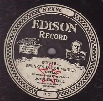 The song became popular on land in America as well. A catalogue of "folk-songs" from the Midwest included it in 1915, where it was said to be sung while dancing "a sort of reel".[18] More evidence of lands-folk's increasing familiarity with "Drunken Sailor" comes in the recording of a "Drunken Sailor Medley" (c. 1923) by U.S. old-time fiddler John Baltzell. Evidently, the tune's shared affinities with Anglo-Irish-American dance tunes helped it to become readapted as such as Baltzell included it among a set of reels.