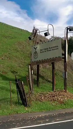 The Dry Creek Rancheria is the land base (reservation) of the Dry Creek Rancheria Band of Pomo Indians. The reservation consists today of approximately 75 acres (300,000 m2) near the Russian River, in Sonoma County, approximately 75 miles (121 km) north of San Francisco, California. It is situated about 3 miles southeast of Geyserville.
