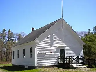 The schoolhouse was built about 1857, and served as the district 3 school (out of 12 districts). It was used as a primary school until 1959, and was adapted for use as a preschool facility in the 1970s. In 1990 the building, including its foundation stones, was relocated to the present location from its original site on Maine State Route 26, about 1.5 miles (2.4 km) away.[2] It is the last of the town's district schools to survive.[3] In the early 1990s it was restored to its original condition except for an outhouse that used to be attached to the building. The restorations cost approximately $12,000. There is a period wood stove, original chalk board and furnishings on the inside. There are also class pictures and textbooks of the time.
