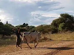 The Dry Zone is the agricultural centre of Myanmar; two-thirds of Myanmar's arable land and 35% of its grain crops are located in the region, and additional economic activities include livestock rearing.[29] The most widely planted crops are sesame, paddy, groundnut, pigeon peas, chickpeas, green gram and sorghum.[30] The Dry Zone accounts for the majority of Myanmar's domestic production of several crops, including 89% of sesame, 69% of groundnut, 70% of sunflower and 95% of cotton production nationwide.[5] The Dry Zone is also a major pulse-growing area, producing 92% of pigeon peas, 97% of chickpeas, and 52% of green gram, largely for export to India.[5] Besides onions, vegetable cultivation is limited.[5]