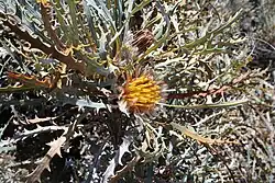 Banksia vestita, commonly known as summer dryandra,[2] is a species of shrub that is endemic to the southwest of Western Australia. It has broadly linear, pinnatifid leaves with sharply pointed teeth on both sides, yellow flowers in heads of between thirty and forty, and broadly egg-shaped follicles.
