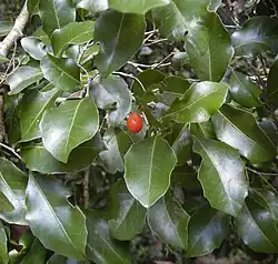 The fruit is a bright red drupe. 12 to 20 mm long with moist yellow flesh inside. The single seed is about 12 mm long, oval in shape with a groove on one side. Fruit mature from February to April. Eaten by the emerald dove, topknot pigeon and wompoo fruit dove. Germination from seed is slow.