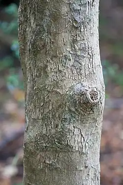 A small to medium-sized tree, up to 25 metres tall and a stem width of 60 cm. The tree is often flanged at the butt and lower part of the trunk. Grey or brown bark, often with scales of bark which fall, leaving shallow depressions. This results in a mottled appearance, similar to the tulipwood. Bark scaly and pustular on older trees. Small branches smooth, slender, grey in colour. Dotted with many lenticels.