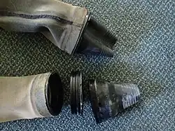 Some styles of cuff ring allow dry gloves to be clipped on over a wrist seal. A seal breaker strand is worn under the cuff seal to allow the interior of the glove to equalise with the sleeve of the dry suit. If the glove is damaged underwater, the strand can be removed to prevent further water leakage into the suit.[35]