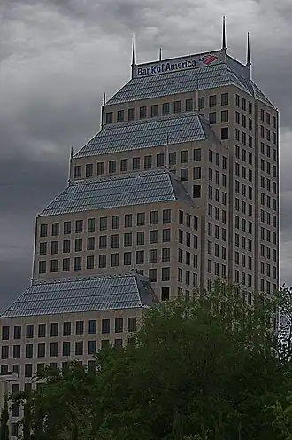 The building is one of the tallest in the city,[3] and is a unique part of the skyline. The postmodern building was designed by Texas-based Morris-Aubry Architects, who modeled the building after their recently completed One American Center in Austin, Texas.[4] Its collection of 10 spires gives it an almost gothic appearance, and its staircase design makes it similar in appearance to another Bank of America building in Houston. The building was owned by Cousins Properties of Atlanta, Georgia, and sold in January 2018 to Southwest Value Partners based in San Diego, California.