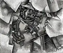 In a review of the 1910 Salon d'Automne the poet Roger Allard (1885-1961) announced the appearance of a new school of French painters who—in contrast with Les Fauves and Neo-Impressionists—concentrated their attention on form rather than on color. A group formed following the exhibition that would include Gleizes, Metzinger, Henri Le Fauconnier, Fernand Léger, and Robert Delaunay (a friend and associate of Metzinger since 1906). They convened regularly at the studio of le Fauconnier where he worked on his ambitious allegorical painting entitled L'Abondance. "In this painting" writes Brooke, "the simplification of the representational form gives way to a new complexity in which foreground and background are united and the subject of the painting obscured by a network of interlocking geometrical elements".[8] But it was Metzinger, a Montmartrois in close contact with Le Bateau-Lavoir and its habitués—including Guillaume Apollinaire, Max Jacob, Maurice Princet, Pablo Picasso and Georges Braque—who introduced to Gleizes and the others of the group, with his Nu à la cheminée (Nu), 1910, an extreme species of 'analytic' Cubism (a term that would emerge years later to describe the 1910–1911 works of Picasso and Braque).