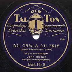 ![]() A vinyl record of "Du gamla, du fria" published by Tal och ton, dated 1930 | |