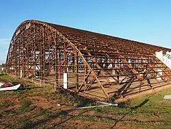 The three Bellman Hangars provide evidence of very early prefabrication techniques in use for buildings in Australia. The double hangar (building 70) and the two single hangars (buildings 2 and 3) were used as mixed- and bulk stores. The British design used a pitched roof and gabled steel frame to provide a standardised design for aircraft maintenance, with sliding doors at each end allowing maximum access. Internal lighting is by high level, clerestory windows.[6] During World War II steel was considered an essential material for armaments and, although steel was available for buildings, many Bellman Hangars were constructed with a framework of unseasoned Australian hardwood.[1][15]