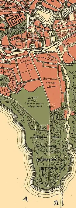 The Dubki horse-iron road was built to serve the armory at Sestroretsk, Russia. The production of the Sestroretsk armory was originally transported to Saint Petersburg along the coast, by road. But the road to the capital existing at that time was inconvenient, since it lay along the coast on quicksands and lowlands, which were periodically submerged by the waters of the Gulf of Finland. Therefore, seagoing scows (barges) later began to be used. In 1847, a horse-drawn tramroad was built from the plant to the Dubkovsky pier on the Gulf of Finland. In the diagram this tramroad is not shown, but it passed along the axis of the street to the centre of the map. The opening and the location of the pier are designated on the map.