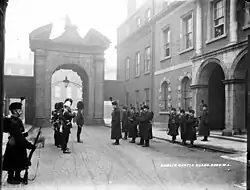 At the very beginning of the Easter Rising of 1916, a force of twenty-five Irish Citizen Army members were able to seize the entrance and guard room of the Castle before reinforcements for the small garrison arrived.[17] During the Anglo-Irish War the Castle was the nerve centre of the British effort against Irish separatism. On the night of Bloody Sunday in 1920, three Irish Republican Army members Dick McKee, Conor Clune and Peadar Clancy, were tortured and killed there.[18][19][20]
