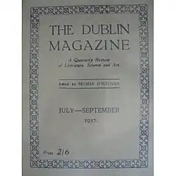 The Dublin Magazine was an Irish literary journal founded and edited by the poet Seumas O'Sullivan (real name James Sullivan Starkey) and published in Dublin by "Dublin Publishers, Ltd., 9 Commercial Buildings. London: Elkin Mathews, Cork St. W.1."[1] The last page of the July 1925 issue (below the book reviews) states the it was printed by Cahill & Co. Ltd. Parkgate Printing Works and published by the proprietors of The Dublin Magazine at 7–9 Commercial Buildings, Dame Street, Dublin.