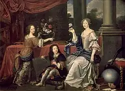 La Vallière's children were raised by Colbert and his wife; she only saw them occasionally. Her eight-year-old daughter, Marie-Anne, Mademoiselle de Blois, a child of ‘lively and precocious intelligence’ attended her first ball in January 1674, in her mother's presence[170] Bellefonds worried that La Vallière's attachment to her daughter would prevent her from entering the convent. She admitted that she had ‘sensitivity’, but her feelings for her children were conflicted because of their ‘sinful’ birth: ‘I confess that I was delighted to see her [...] But, at the same time, I had scruples about it [...] These are rather opposite emotions, yet I feel them as I tell you’.[171] She commissioned a painting of her and her children, probably as a remembrance for them.[172]
