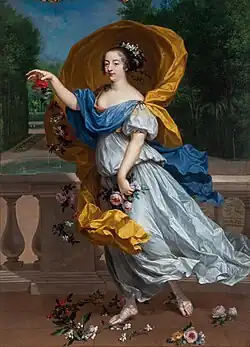 In April 1661, the King's younger brother, Philippe, the new Duke of Orléans (‘Monsieur’), married Henrietta of England (‘Madame’). Madame's household was organised by Madame de Choisy, Jeanne de Bélesbat de Hurault,[29] a distant relative of La Vallière and member of the former Orléans household.[25][26][30] She placed La Vallière and Montalais in the new Orléans household as filles d’honneur.[31] La Vallière and her brother (who was embarking on a military career) had no money, but nobody was willing to lend to minors. They petitioned a judge who instructed their mother and stepfather to borrow money for them.[19] La Vallière joined the Orléans household in the Tuileries Palace after the wedding.[32][33] On 19 April, they moved to the court in Fontainebleau.[2][34] The King's attendants courted the maids-of-honour of Madame; La Vallière's suitor was Armand de Gramont, Count of Guiche.[35]