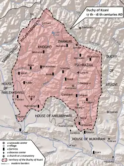 The Duchy of Ksani (Georgian: ქსნის საერისთავო) was an administrative unit in feudal Georgia. It consisted lands around Ksani and two more neighbouring south-western valleys, thus making two administrative entities: Ksniskhevi, with its centre in Kvenipnevi and Tskhradzmiskhevi with its centre in Largvisi, which is also home of the Largvisi Monastery.