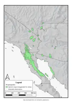 In Baja California, it is found in the Peninsular Ranges continuing from California into the Guadalupe Valley, but not reaching the coast, extending down the desert on sky islands until it reaches the southern limit of Ángel de la Guarda Island. In Sonora, it exists on the desert coast from the Colorado River delta and Puerto Peñasco to just north of Tiburón Island.[8]