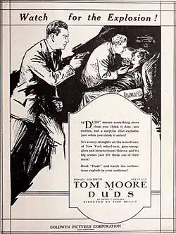 Duds is a 1920 American silent mystery film directed by Thomas R. Mills, and starring Tom Moore, Naomi Childers, Christine Mayo, Edwin Stevens, Lionel Belmore, and Edwin Wallock. It is based on the Saturday Evening Post story of the same name by Henry C. Rowland, which became a novel shortly before the film was released. The film was released by Goldwyn Pictures on February 22, 1920.[1][2][3]