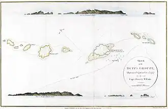 The Duff Islands were named after missionary ship Duff, captained by James Wilson, which reached them in 1797.
