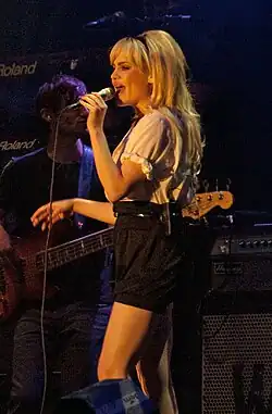 Duffy has performed at concerts and festival gigs around the world. Her first American performances took place at the SXSW conference,[53] and the Coachella Valley Music and Arts Festival was her first festival gig.[54] To coincide with the release of Rockferry, Duffy performed at the Apollo Theater in New York City.[55] Duffy received the honour of performing at the Royal Variety Performance 2008.[56] In 2008, Duffy played many festivals in Europe. This included visits to French,[57] Swedish and Irish[58] summer festivals, amongst others. In the United Kingdom, Duffy played venues such as Glastonbury and the Evolution Festival. She also toured the American summer festivals in 2008, including a visit to Lollapalooza in Chicago.[59] She toured the United Kingdom and Ireland during November and December 2008.[60] To promote Rockferry, Duffy made many visits to American television, including Late Night with Conan O'Brien,[61] and Saturday Night Live.[62] Duffy played a fourteen-city North American tour. Plans had called for her to open for Coldplay on six of the dates.[63] During a concert in Cleveland, Duffy accidentally set the left side of her hair on fire.[64] In New York, Duffy was left apologising to an audience after briefly bursting into tears. She stated to the audience that this happens in one out of every 15 of her shows when she feels exposed for reasons she does not fully understand.[65] Duffy also made a recording for British broadcaster BBC, performing at the LSO St. Luke's. The performance was televised in 2009 on the British television station BBC One.[66]
