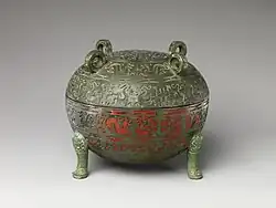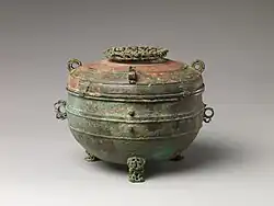 Some dui vessels were inspired by nomadic Steppe art with sophisticated designs and colorful exteriors. After the Eastern Zhou dynasty, the dui might have been seen as a status symbol or used in various rituals. It was most popular during the Late Zhou Dynasty, but later it was replaced by another food container named "sheng" that was used during the Qin and Han dynasties.[7] In the Warring States Period, the form was changed to an oval and the lid was transformed to reflect the body in a mirror image. They are sometimes marked as "watermelon ding" which were dated back to the early Warring States Period.[1]