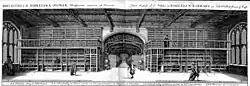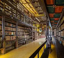 The library was constructed as a second storey to the Divinity School between 1450 and 1480 in order to house the collection.[1] In 1550, during the Reformation, the King's Commissioners despoiled the library in order to destroy the vestiges of Roman Catholicism in the country. Some of the books were taken and hidden by people in their homes to protect them- they are slowly returning to circulation, and in 1556 the furniture was removed by the university. Today, only three of Humfrey's original books remain in the library.[2] The MS. Duke Humfrey c. 1 was reacquired in the 2020s, with a history of ownership from Jean le Bon, King of France in the mid C14th to Lancastrian royalty in England by early C15th.[3][4]
