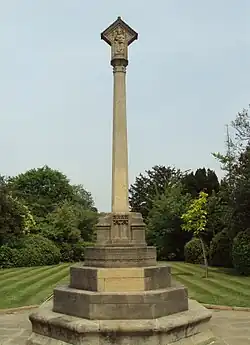 The memorial is in the form of a tall tapering shaft of Hopton Wood stone, topped by a diamond entablature which bears carved images of Christ the King to the north and south sides.[2]
