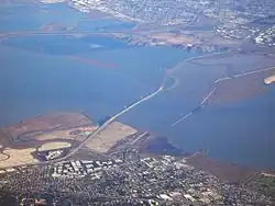 The Dumbarton Bridge is the southernmost of the highway bridges across San Francisco Bay in California. Carrying over 70,000 vehicles[1] and about 118 pedestrian and bicycle crossings daily[2] (384 on weekends[3]), it is the shortest bridge across San Francisco Bay at 1.63 miles (8,600 ft; 2,620 m). Its eastern end is in Fremont, near Newark in the San Francisco Bay National Wildlife Refuge, and its western end is in Menlo Park. Bridging State Route 84 across the bay, it has three lanes each way and a separated bike/pedestrian lane along its south side. As with the San Mateo–Hayward Bridge to the north, power lines parallel the bridge.