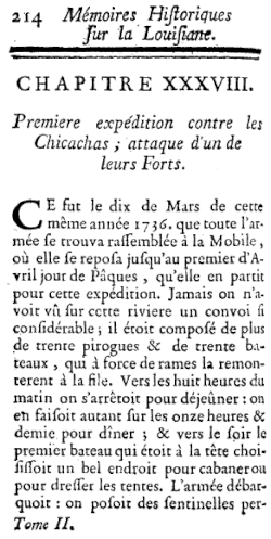 - ^ Foret, Michael J. (1995). "The failure of administration: The Chickasaw Campaign of 1739-1740" in Conrad, Glenn R., The French Experience in Louisiana. Lafayette, Louisiana: University of Southern Louisiana, ISBN 0-940984-97-0.