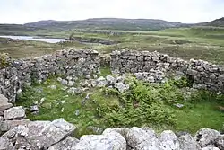 The interior of the broch contains a double cell in the side wall, and a "guard cell" at the foot of the stairs.[2] The rest of the inner wall is occupied by a ground level gallery.[2] The door to this mural gallery goes right through the wall to form a small second entrance. It is not certain if this second entrance is part of the original structure, since other second entrances found in brochs elsewhere appear to be of later construction.[2]