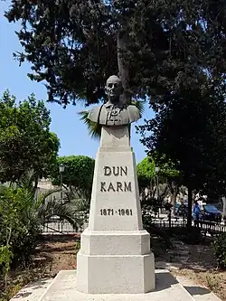 Carmelo Psaila, better known as Dun Karm Psaila (18 October 1871 – 13 October 1961) was a Maltese Roman Catholic priest, writer and poet, sometimes called the "bard of Malta".[1] He is widely recognised as the Maltese national poet and as the lyricist for the Maltese national anthem (Maltese: L-Innu Malti).