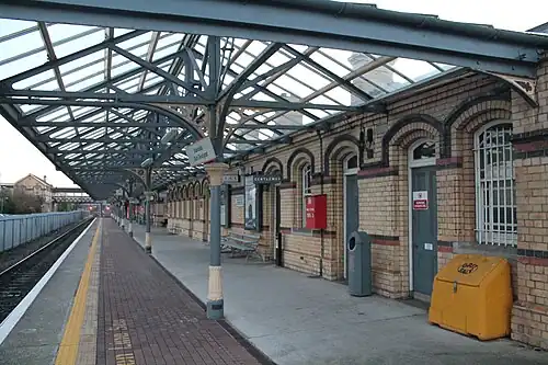 Dundalk Clarke railway station was designed by the first chief engineer of the Great Northern Railway, William Hemingway Mills. Known for its polychromatic brickwork featuring Italianate and Spanish stylistic influences, the station has a lattice-style footbridge connecting the elevated ticket office to the island platform below. Historically, sliding windows in the Victorian walkway let ticket office staff have direct communication with the platform and trains below.[8]