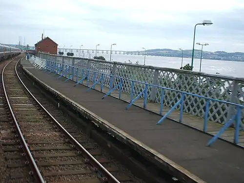 The station opened on 1 May 1889 by the North British Railway, opening after the second Tay Bridge was built. On the eastbound platform was a signal box that has 'Tay Bridge North' on it, replacing the old one. This signal box closed in 1928. To the east were a group of sidings on the north and south sides of the station. The south set of sidings were later removed and the northern set were reduced to just two sidings. The station closed on 1 January 1917 but reopened on 1 February 1919, only to close again on 2 October 1939.[1][2]