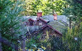 Located in the foothills of the Northern Oregon Coast Range, the farm is on Dundee Road northwest of the city of Gaston near Henry Hagg Lake in the western part of the county. All three of the buildings on the farm were designed by E. E. Green in a rustic style.[2][9] The 1+1⁄2-story structures were all built around 1921 and featuring primarily round logs for the exterior.[2][9] The buildings also used brick on the exterior.[2] This creates a log cabin look for the symmetrical U-shaped main building.[10] The interior leaves the round logs exposed,[11] with some wood paneling and a brick fireplace.[12]