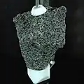 basalt | Blocky, angular, highly vesicular basalt. Vesicles appear to grade in size and abundance across the rock. One surface is coated by light yellowish-gray material grading into very dark brownish-gray coating at one edge. The rock is porphyritic with brown pyroxene prisms to 10 mm long in a groundmass of plagioclase laths and pyroxene. |
