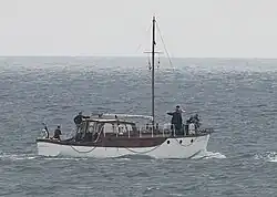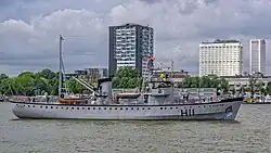 Crowley and marine coordinator Neil Andrea located nearly sixty ships,[19][74] which Nolan had reconditioned for the shoot.[35][76] These included the retired French Navy destroyer Maillé-Brézé,[77] which was made to look like a 1940 British warship[24] as there were no wartime British destroyers left with working engines.[19] Three retired Royal Netherlands Navy ships were also used: the minesweeper HNLMS Naaldwijk portrayed HMS Britomart, HNLMS Sittard portrayed HMS Havant and HMS Jaguar, and MLV Castor (a Royal Netherlands Navy armed pilot vessel) portrayed HMS Basilisk.[78][79] The motor torpedo boat MTB 102 and the 1930s Norwegian steamer Rogaland were also used.[19][80] Over fifty other boats included twenty actual Little Ships of Dunkirk, piloted by their owners.[19] A small 1930s motor yacht called Moonstone served for six weeks of filming; its most demanding scenes, with up to sixty people on a boat designed for fewer than ten, were shot on the Dutch lake IJsselmeer[24][35][74] to avoid the challenge of the Dunkirk tides.[18] The hospital ship which was sunk in the beginning, was the Norwegian cargo ship, and World War II veteran, MS Rogaland.