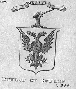 The first recorded Dunlop is William de Dunlop of 1260, followed by a supporter of Edward I, Neil Fitz-Robert de Dulap of 1306. His estates were forfeited due to his support for John Balliol, as were those of the De Rosses. The family regained their lands by the mid 15th. Century and by that time we have 'of that Ilk' replacing the Norman 'de'. Sir James Dunlop of that Ilk held the estate in 1596 and married Jean, daughter of Somerville of Cambusnethan, descended from Lord Somerville.[28] This may go some way to explaining why the Somerville family came to purchase lands at Montgomery-Crivoch and Bollingshaw in the 1800s to establish the Kennox Estate.