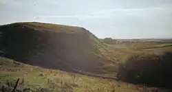 In 1848 the Scottish Journal records that a number of years ago the foundation of a ruin of considerable extent was removed by the late proprietor.[19] In 1853 Mr Dobie recorded that There can still be traced the meiths (boundary line) of a building of considerable extent on the top of the Hill of Borland.[20] In 1856 Mr G. Howie of Dunlop stated that he remembered seeing a small portion of what was said to be one of the walls about 70 or 80 years ago. It was a sort of bank, quite crumbled down and overgrown with grass. Since then the ruins of a building of considerable extent have been removed and the ground cultivated.[21] On the southern side of the hill there are the remains of a wide ditch or fosse, locally known as the 'Cuckoo slide’.[22] Paterson[23] in 1866 states that the foundation of a ruin was removed some years ago by a late proprietor.
