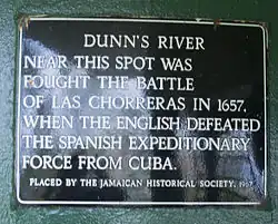 The falls were the location where the Battle of Las Chorreras took place in 1657, when the British defeated a Spanish expeditionary force from Cuba.[8] A plaque placed at the bottom of the falls by the Jamaican Historical Society commemorates the event (see photo).