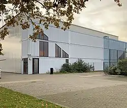 In 2008, Container City was commissioned by the London Borough of Lambeth, with funding from the Building Schools for the Future scheme, to construct Dunraven's full-height sports hall. Made using old 40 freight containers, it took three months to build, with its containers being modified off site, and three days to install,[8][9] the first of its type in the world, and built with little disruption to school life.[8] Similar sports halls were subsequently built in India, China, Norway, USA and Nigeria.[9][10] Over its three storeys, it has a full sized basketball court, three sides of viewing galleries[8] and two changing rooms.[11] It is also connected to the school's rainwater harvesting facility,[8] has lighting controlled by motion sensors, and a heating system controlled by the weather.[11]