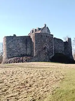 The gatehouse was built by the Campbells in the late 15th century, replacing an earlier round tower in the east corner. It takes the form of a four-storey harled tower house, with the entrance passage running through half the vaulted basement, the other half forming guard rooms with arrow slits facing the gate. The present approach to the gate is by a stone stair, replacing an earlier drawbridge.[22] The tower was remodelled in the 18th century to provide reception rooms and a private suite. The dormer windows at the top are capped by the pediments from the 1725 house (see below), and bear the date, the Campbell arms, and the initials AEC and DLC, for Aeneas Campbell, 11th Captain, and his wife Dame Lilias. The pediments were moved here during the 1903 restoration works.[23]