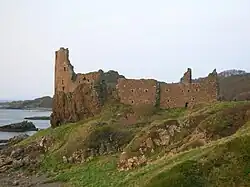 The site dates from the late 13th century; the earliest charter for the lands dating from 1256, but the remains of the building are of 15th- and 16th-century origin.[1] One tradition says that the castle was built by the Danes. Another claims that the Mackinnons held the castle from Alexander III as a reward for their valour at the Battle of Largs.[2][3]