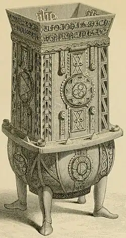 On the outside of the rim is an engraved inscription in black lettering in two lines. The spaces between the letters are hatched with fine lines, which intersect diagonally. The angels of the rim have strips ornamented with niello. The inside of the rim is plain by comparison; except for the letter I.H.S. repeated on all four sides. [3] This is a Christogram representing Jesus Christ. Each side of the cup has varied designs of triangles and circles. R.C. MacLeod considered these to be representations of the Trinity and Eternity.[6] Ian Finlay described the circled, six-pointed stars as not unlike those on the outer-side of the Domnach Airgid, which is held in the National Museum of Ireland.[5] Empty sockets on the outside of the cup are thought to have once held stones, or glass. Several somewhat smaller sockets still hold beads of coral. The silver legs are in the form of human legs; and are ornamented with a twisted wire which runs down the front. The feet wear shoes, which are covered in niello, and the legs are gilt. [3] Everywhere except the rim, the silver is very thin, and in consequence has suffered a great deal of damage over the years. The cup has been classified as a mether, a communal drinking cup used at ceremonial events, by its square shape at the top and rounded bottom.